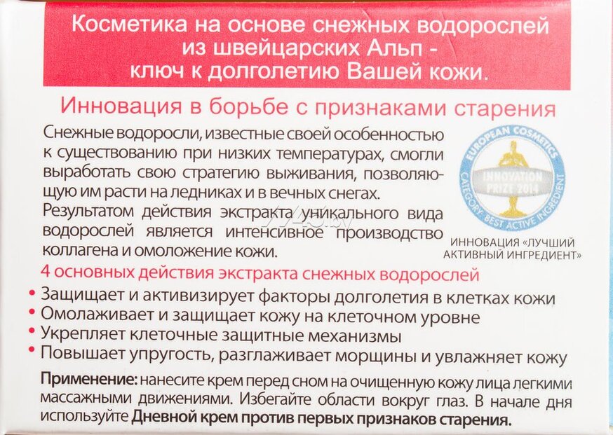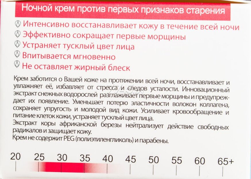 Применение: нанесите крем вечером на очищенную кожу лица легкими массажными движениями. Избегайте область вокруг глаз. Утром используйте Дневной крем против первых признаков старения.