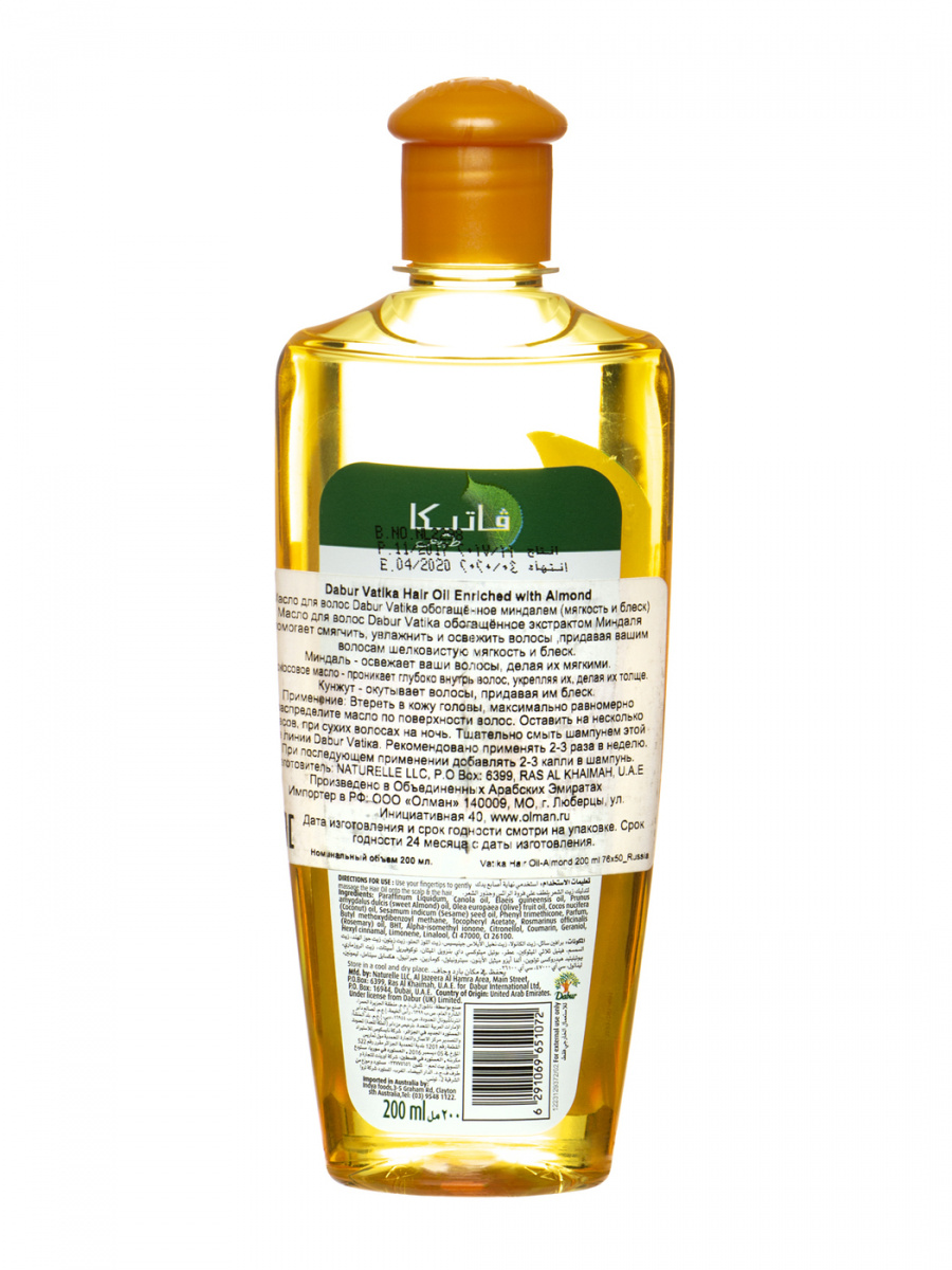 - Состав: Масло Миндаля – укрепляет волосы, улучшает их рост, делает их мягкими, предотвращает зуд и сухость кожи головы, обеспечивает полноценное питание, придаёт блеск и шелковистость. Кокосовое масло – идеально подходит для всех типов волос, проникает глубоко в структуру волос, укрепляя, защищая и питая их, восстанавливает волосяные луковицы и естественное покрытие волос, защищает от воздействия загрязнённого воздуха и ультрафиолетовых лучей. Кунжутное масло – обладает согревающим эффектом, питает и увлажняет волосы, восстанавливает их структуру, придаёт блеск.