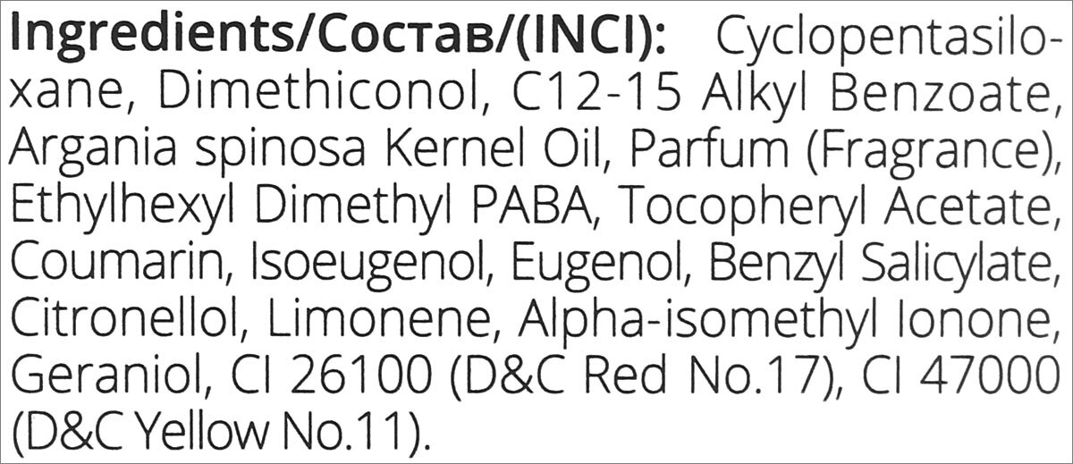 - Состав: Cyclopentasiloxane, Dimethiconol, C12-15 Alkyl Benzoate, Argania Spinosa Kernel Oil, Parfum, Ethylhexyl Dimethyl PABA, Tocopheryl Acetate, Coumarin, Isoeugenol, Eugenol, Benzyl Salicylate, Citronellol, Limonene, Alpha-isomethyl Ionone, Geraniol, CI 26100, CI 47000.