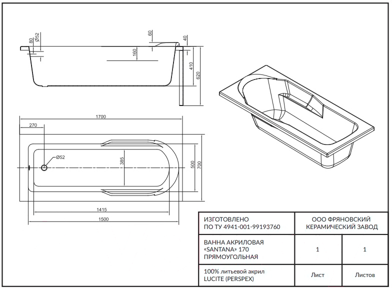 Ванна акриловая Cersanit Santana 170x70 (с ножками); Размещение: встраиваемая; Гидромассаж: нет; Особенность модели: подлокотники литые, антиаллергенная, подголовник литой, площадка под установку смесителя; Объем: 190 л; Ножки в комплекте: есть; Толщина стенок: 4;4 мм