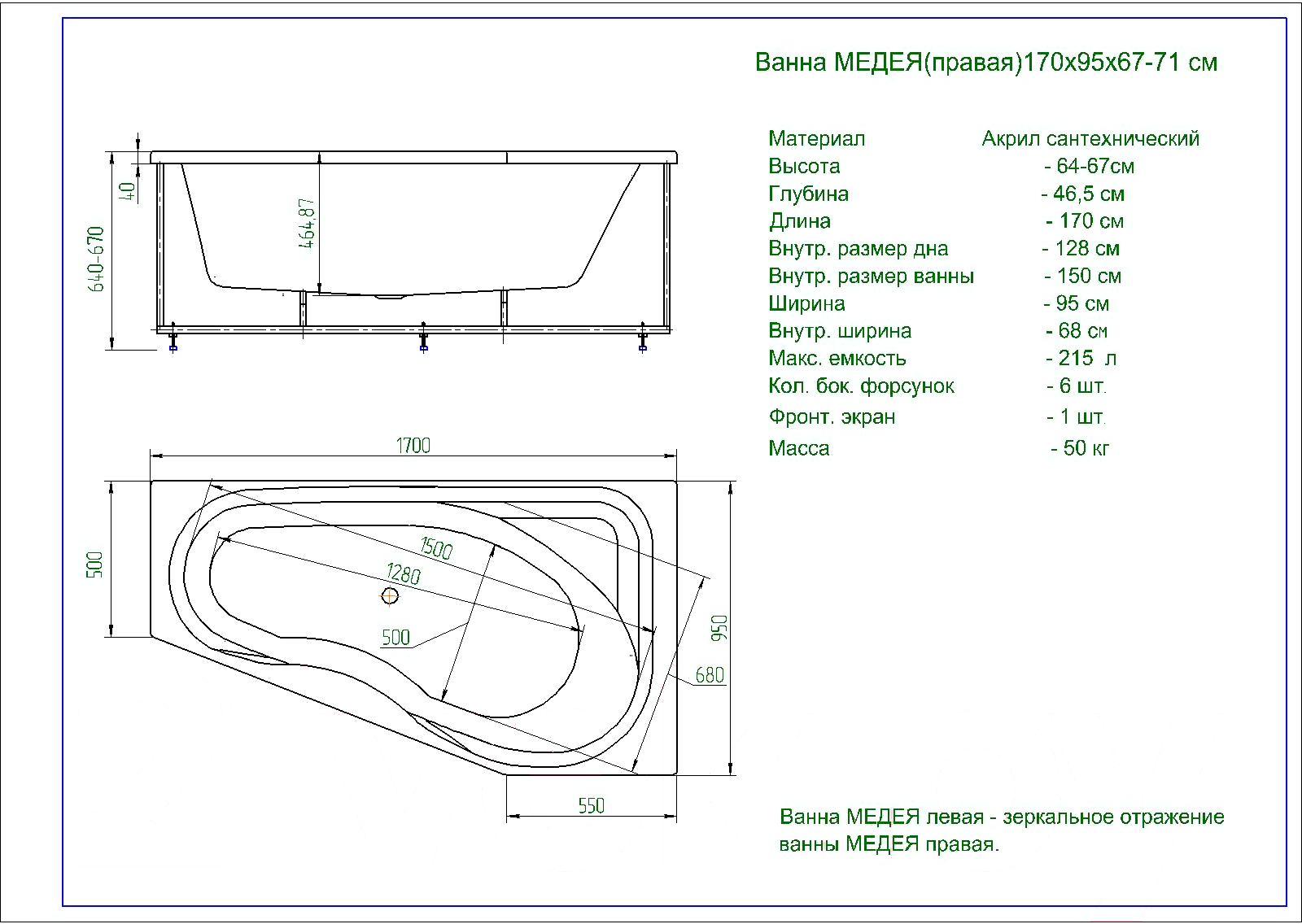 • Комплект поставки ванна, панель фронтальная, каркас, слив-перелив, панель торцевая