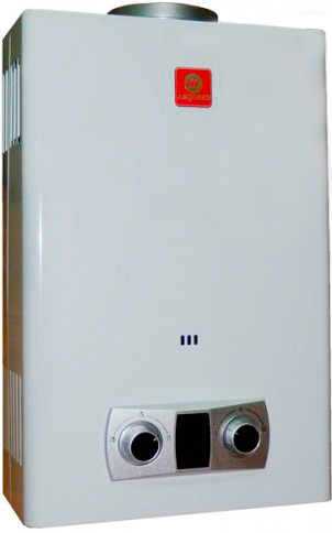 Водонагреватель проточный, газовый нагрев, мощность 19 кВт, производительность 10 л/мин, вертикальная установка, подводка нижняя, максимальная температура нагрева 85 °C, защита от перегрева.