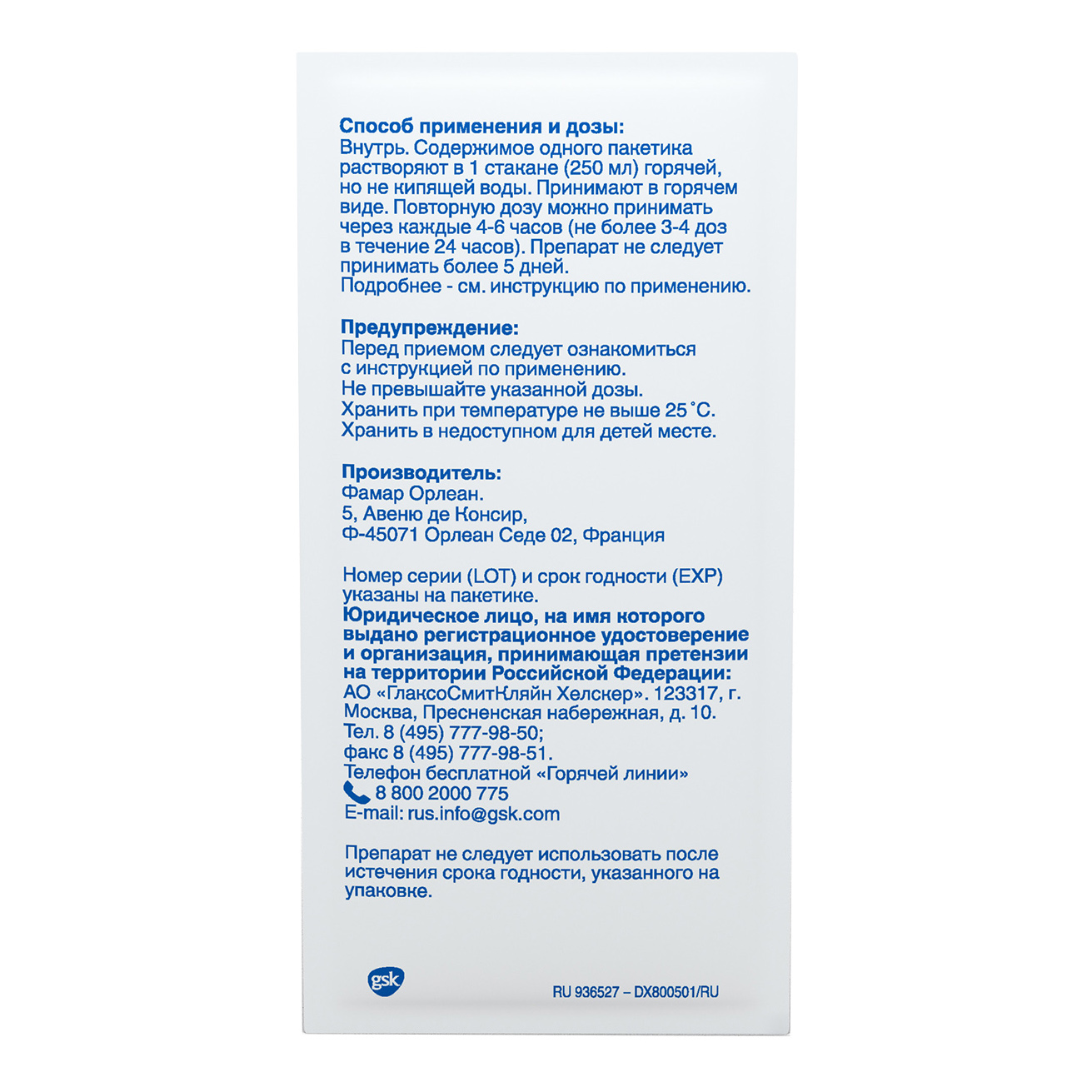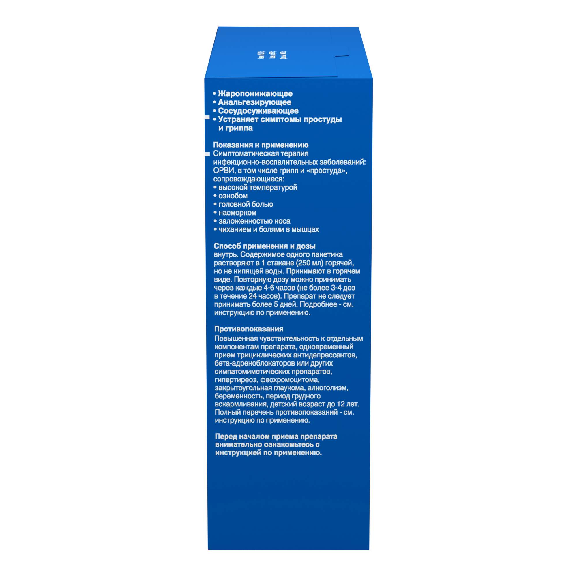 Рекомендации по приему (дозировка)внутрь, содержимое одного пакетика растворяют в 1 стакане (250 мл) горячей, но не кипящей воды, принимают в горячем виде, повторную дозу можно принимать через каждые 4-6 часов (не более 3-4 доз в течение 24 часов), препарат можно применять в любое время суток, но наилучший эффект приносит прием препарата перед сном, на ночь, не следует принимать препарат более 5 дней