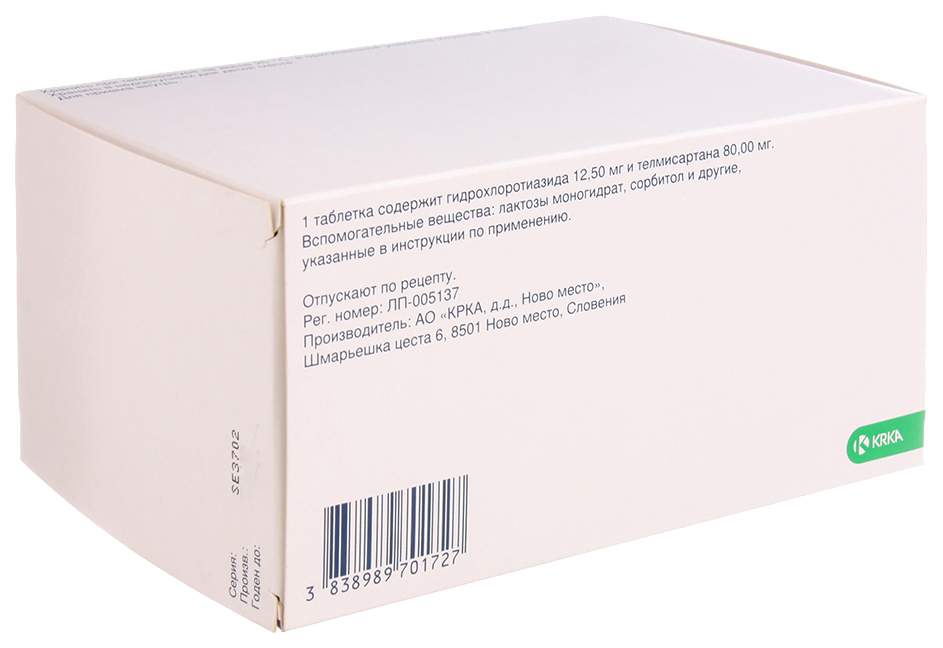 - Состав телмисартан 80 мг, гидрохлоротиазид 12,5 мг, меглюмин, натрия гидроксид, повидон К30, лактозы моногидрат, сорбитол, магния стеарат, маннитол, маннитол (E421) DC, краситель железа оксид красный (E172), гипролоза, кремния диоксид коллоидный, натрия стеарилфумарат