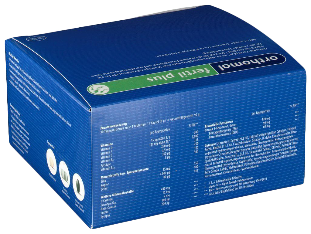 - Состав витамин D 15 мкг (600 I.E.), витамин E 120 мг alpha-TE, витамин C 250 мг, витамин B6 3,5 мг, фолиевая кислота 300 мкг, витамин B12, цинк 15 мг, медь 1 мкг, селен 80 мкг, L-карнитин 440 мг, коэнзим Q10 15 мг, бета-каротин 2 мг, лютеин 800 мкг, ликопин 200 мкг, омега-3 жирные кислоты, из которых: 170 мг, эйкозапентаеновой кислоты 90 мг, докозагексаеновой кислоты 60 мг