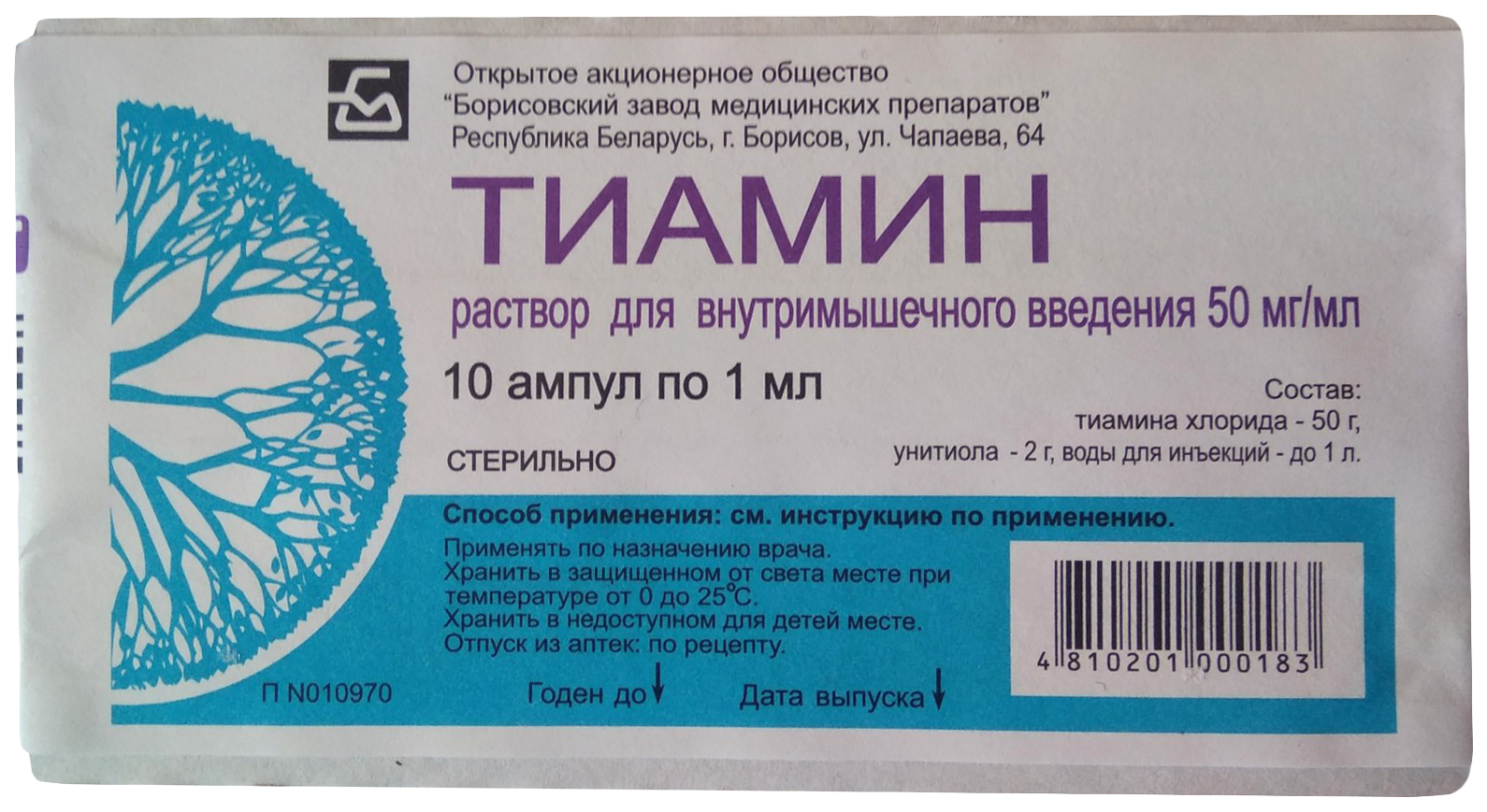 - Состав в 1 мл: 50 мг тиамина хлорида, вспомогательные вещества: унитиол, вода для инъекций