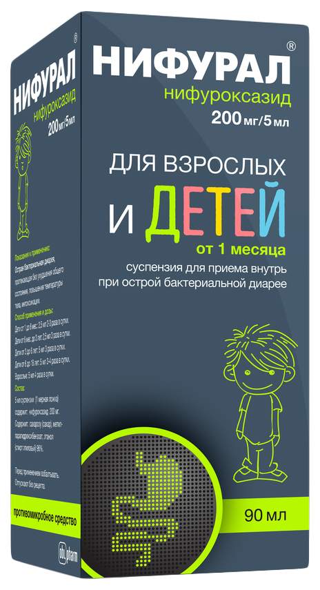 - Рекомендации по приему (дозировка) применяется внутрь, для дозирования используется дозированная ложечка 5 мл, имеющая градуировку 2,5 мл, перед применением суспензию необходимо хорошо встряхнуть, детям от 1 до 6 месяцев: 100 мг нифуроксазида (2,5 мл суспензии) 2-3 раза в сутки (интервал между приемами 8-12 часов), детям от 6 месяцев до 3 лет: 100 мг нифуроксазида (2,5 мл суспензии) 3 раза в сутки (интервал между приемами 8 часов), детям от 3 до 6 лет: 200 мг нифуроксазида (5 мл суспензии) 3 раза в сутки (интервал между приемами 8 часов), детям от 6 до 18 лет: 200 мг нифуроксазида (5 мл суспензии) 3-4 раза в сутки (интервал между приемами 6-8 часов), взрослым: 200 мг нифуроксазида (5 мл суспензии) 4 раза в сутки (интервал между приемами 6 часов), продолжительность курса лечения 5-7 дней, но не более 7 дней