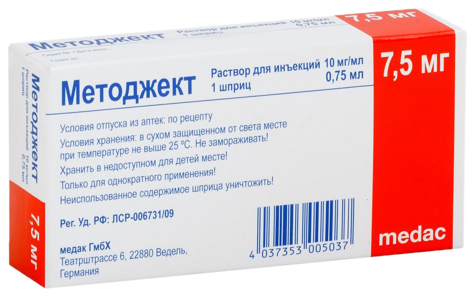 - Состав метотрексата - 10 мг(1 шприц - 7, 5 мг), натрия хлорид, натрия гидроксид, вода д/и