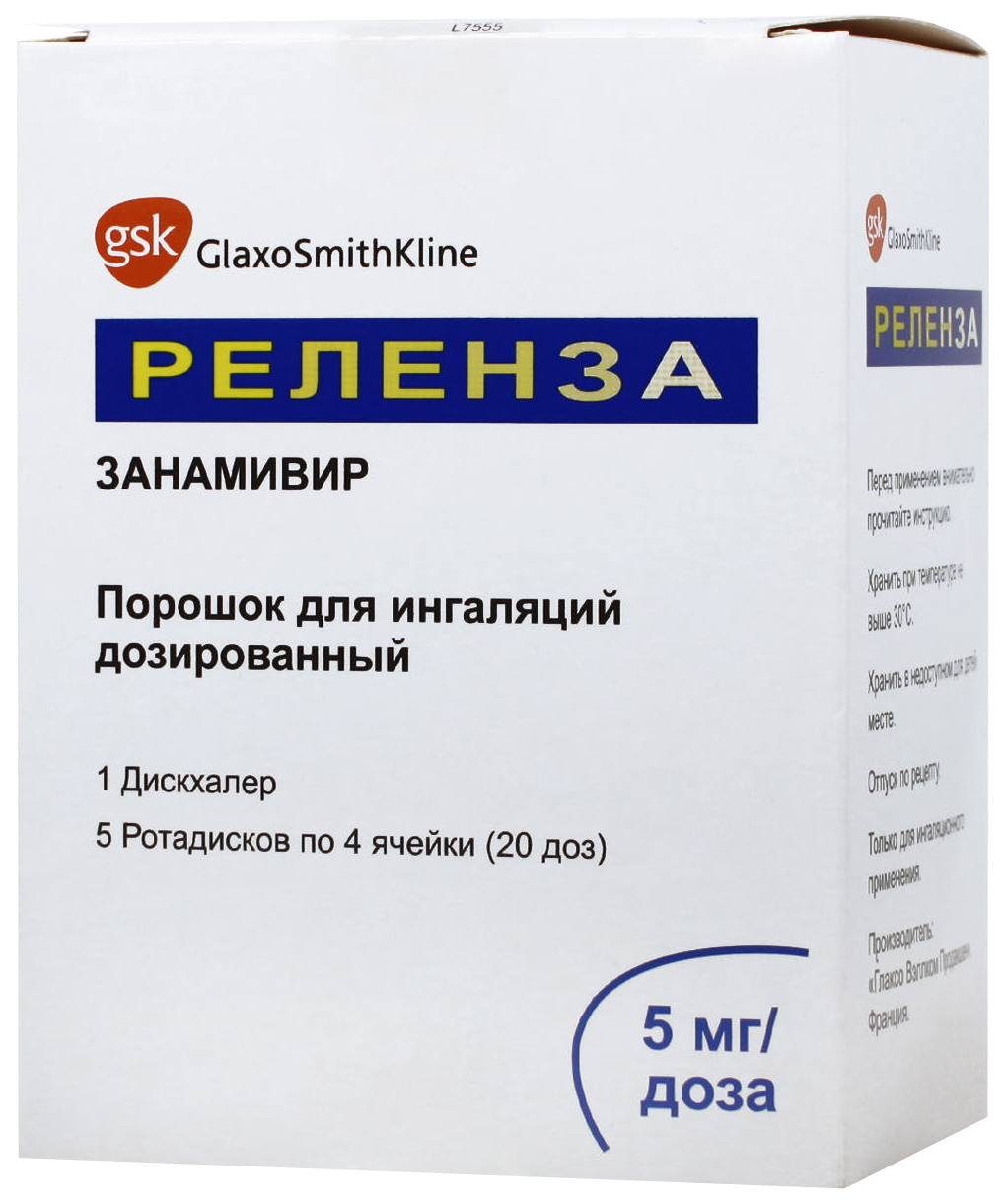 - Рекомендации по приему (дозировка) препарат Реленза применяется только в виде пероральной ингаляции с помощью прилагаемого устройства Дискхалер, лечение: взрослые и дети - рекомендуемая доза препарата Реленза составляет две ингаляции (2×5 мг) 2 раза/сут в течение 5 дней, общая суточная доза составляет 20 мг, для достижения оптимального эффекта следует начинать лечение как можно раньше (желательно в течение 2 дней) при появлении первых симптомов заболевания, профилактика: взрослые и дети - рекомендуемая доза препарата Реленза составляет две ингаляции (2×5 мг) 1 раз/сут в течение 10 дней, общая суточная доза составляет 10 мг, период профилактической терапии может быть увеличен до одного месяца, если период риска контакта с возбудителем инфекции превышает 10 дней