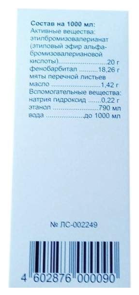 - Состав в 1 мл: альфа-бромизовалериановой кислоты эфир этиловый - 20 г, фенобарбитал - 18,26 г, мяты перечной листьев масло -1,42 г, вспомогательные вещества: этанол 95% - 790 мл, натрия гидроксид - 0,22 г, вода очищенная - до 1000 мл