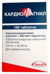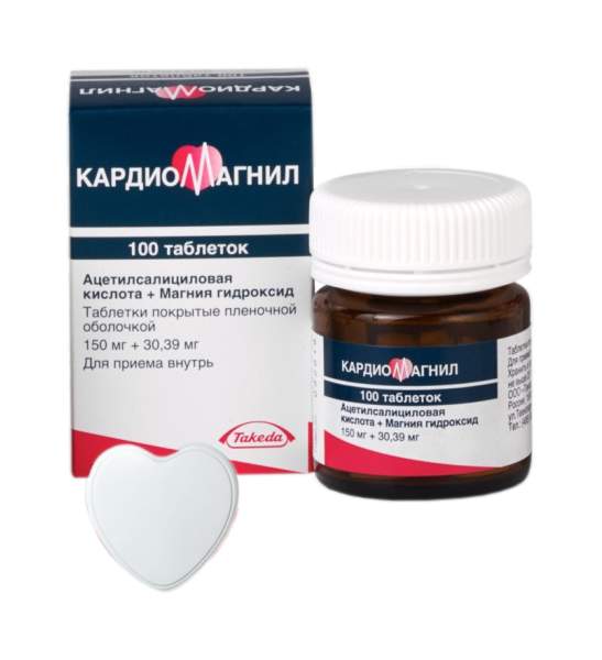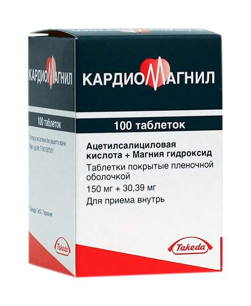 - Рекомендации по приему (дозировка) таблетки следует проглатывать целиком, запивая водой, для первичной профилактики сердечно-сосудистых заболеваний, таких как тромбоз и острая сердечная недостаточность при наличии факторов риска (например, сахарный диабет, гиперлипидемия, артериальная гипертензия, ожирение, курение, пожилой возраст) назначают по 1 таб. Кардиомагнила, содержащего ацетилсалициловую кислоту в дозе 150 мг в первые сутки, затем по 1 таб. Кардиомагнила, содержащего ацетилсалициловую кислоту в дозе 75 мг 1 раз/сут., для профилактики повторного инфаркта миокарда и тромбоза кровеносных сосудов назначают по 1 таб. Кардиомагнила, содержащего ацетилсалициловую кислоту в дозе 75-150 мг 1 раз/сут, для профилактики тромбоэмболии после хирургических вмешательств на сосудах (аортокоронарное шунтирование, чрескожная транслюминальная коронарная ангиопластика) назначают по 1 таб. Кардиомагнила, содержащего ацетилсалициловую кислоту в дозе 75-150 мг 1 раз/сут, при нестабильной стенокардии назначают по 1 таб. Кардиомагнила, содержащего ацетилсалициловую кислоту в дозе 75-150 мг 1 раз/сут