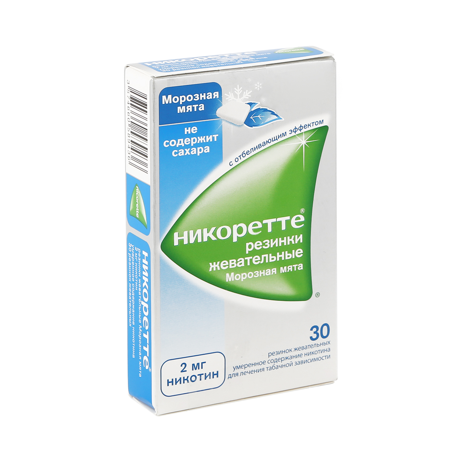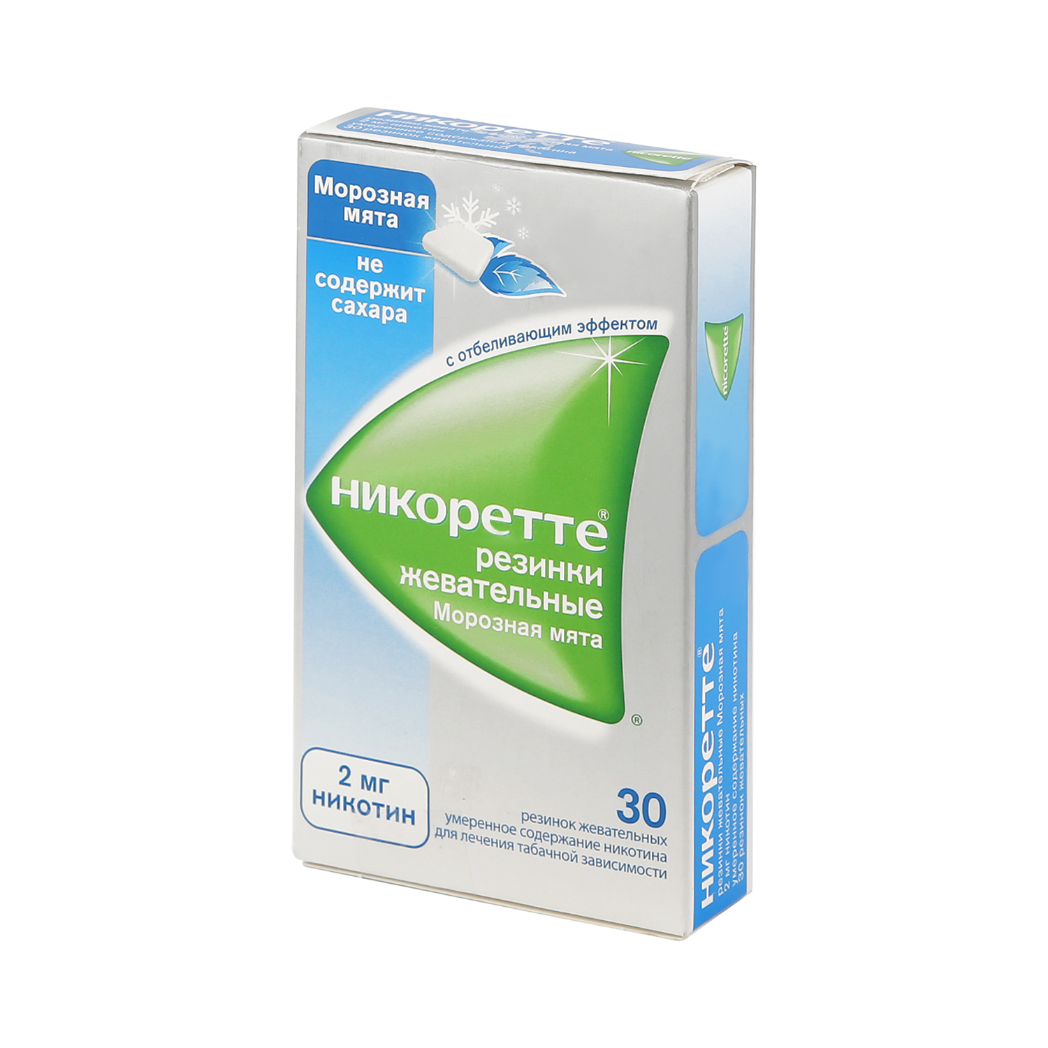 - Побочные действия препарата В рекомендуемой дозе Никоретте® не вызывает серьезных неблагоприятных эффектов. В начале лечения содержащийся в жевательной резинке никотин иногда может вызывать слабое раздражение горла и усиленное слюноотделение, при проглатывании чрезмерного количества растворенного никотина возможна икота. При чрезмерном употреблении препарата лицами, не привыкшими к вдыханию табачного дыма, возможны тошнота, слабость, головная боль (аналогично симптомам, возникающим у таких пациентов при вдыхании табачного дыма). Со стороны ЦНС: очень часто - головная боль; часто - головокружение. Со стороны сердечно-сосудистой системы: иногда – учащенное сердцебиение; очень редко – предсердные нарушения ритма. Со стороны пищеварительной системы: очень часто – желудочно-кишечный дискомфорт, икота, тошнота; часто - рвота. Дерматологические реакции: иногда – эритема, крапивница. Прочие: очень часто – боль в горле или во рту, боли в жевательных мышцах; редко - аллергические реакции, включая ангионевротический отек. Некоторые симптомы, такие как головокружение, головная боль, нарушения сна, могут быть проявлениями синдрома отмены, вызванного отказом от курения. При отказе от курения может увеличиваться частота возникновения афтозного стоматита. При применении жевательной резинки с содержанием никотина 4 мг у пациентов, предрасположенных к расстройству пищеварения возможны незначительные расстройства пищеварения или изжога. Обычно эта проблема устраняется при более медленном жевании резинки или использования резинки, содержащей 2 мг никотина (при необходимости с меньшим интервалом).