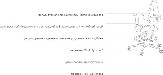• Регулировка высота сиденья, высота спинки, наклон спинки, высота подлокотников, глубина сиденья, наклон сиденья, высота подставки для ног