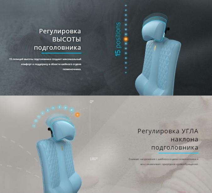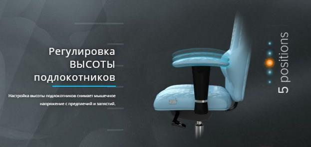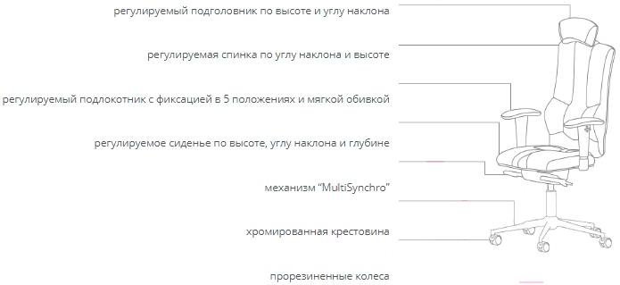 Регулировкавысота сиденья, высота подлокотников (с фиксацией в 5 положениях), высота подголовника, наклон подголовника, глубина сиденья, наклон сиденья