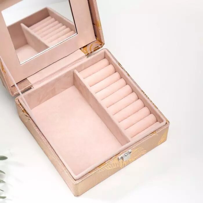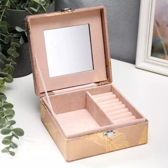 • Особенности шкатулки Для украшений, С внутренней обивкой, С делениями, С замочком, С зеркалом