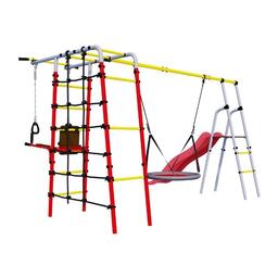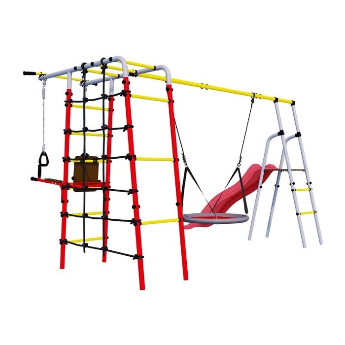 - Комплектация Горка, Сетка, Качели, Лестница, Нерегулируемый турник, Рукоход, Кольца