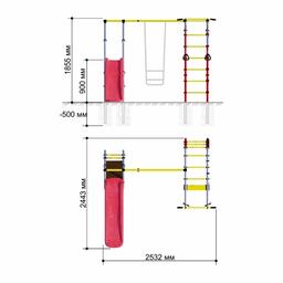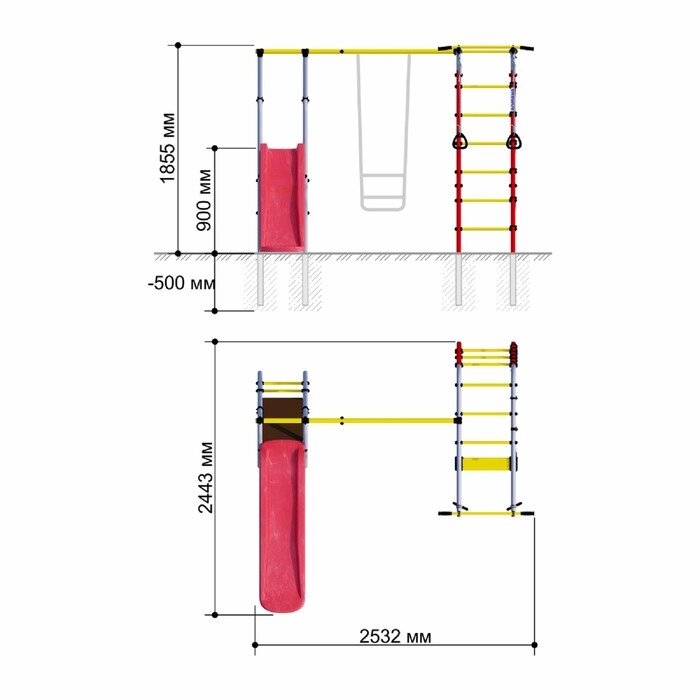 - Комплектация Качели, Лестница, Сетка, Кольца, Горка, Нерегулируемый турник