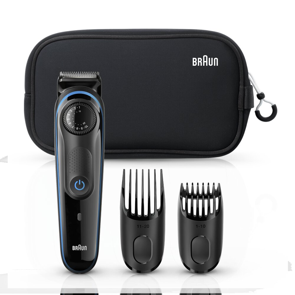Комплектация:триммер для бороды Braun BT3940TS в цвете черный/синий, насадка-гребень для коротких волос (1-10 мм), насадка-гребень для длинных волос (10-20 мм), бритва Gillette Fusion ProGlide с технологией FlexBall, щеточка для чистки, зарядное устройство SmartPlug, несессер