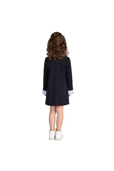 Стильное платье для девочки из трикотажного вискозного полотна с отделкой из хлопковой ткани с рисунком в полоску. Платье полуприлегающего силуэта с трапециевидным расширением к низу. Длинна платья - до колена. Горловина с сорочечным воротником, застегивающимся на петлю и пуговицу. На спинке расположена застежка на потайную тесьму- молнию, расположенную в среднем шве. Рукава втачные, длинные, одношовные. По низу рукавов притачан волан со сборкой из хлопковой ткани с рисунком в полоску. Комфортное и практичное платье станет прекрасным выбором для школьницы.