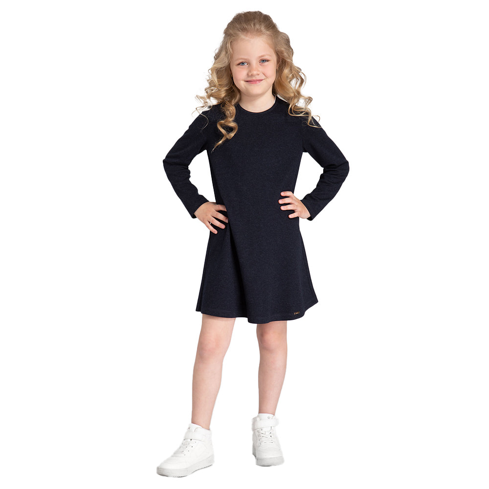 Базовое платье для девочки из трикотажного вискозного полотна. Силуэт платья - трапеция. Горловина платья круглая. Рукава длинные, втачные, одношовные. Спинка со средним швом. В верхней части среднего шва спинки расположен разрез и застежка на пуговицу на ножке и петлю из сутажа. На переде платья по низу расположен декоративный элемент лейба металлическая. Платье обеспечит комфорт и удобство. Такое базовое платье отличный вариант для школьных будней.