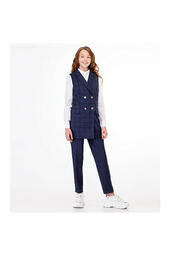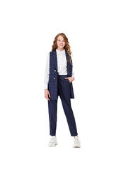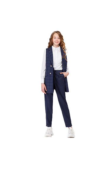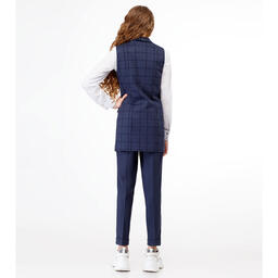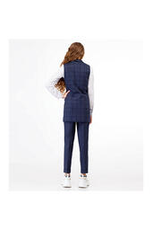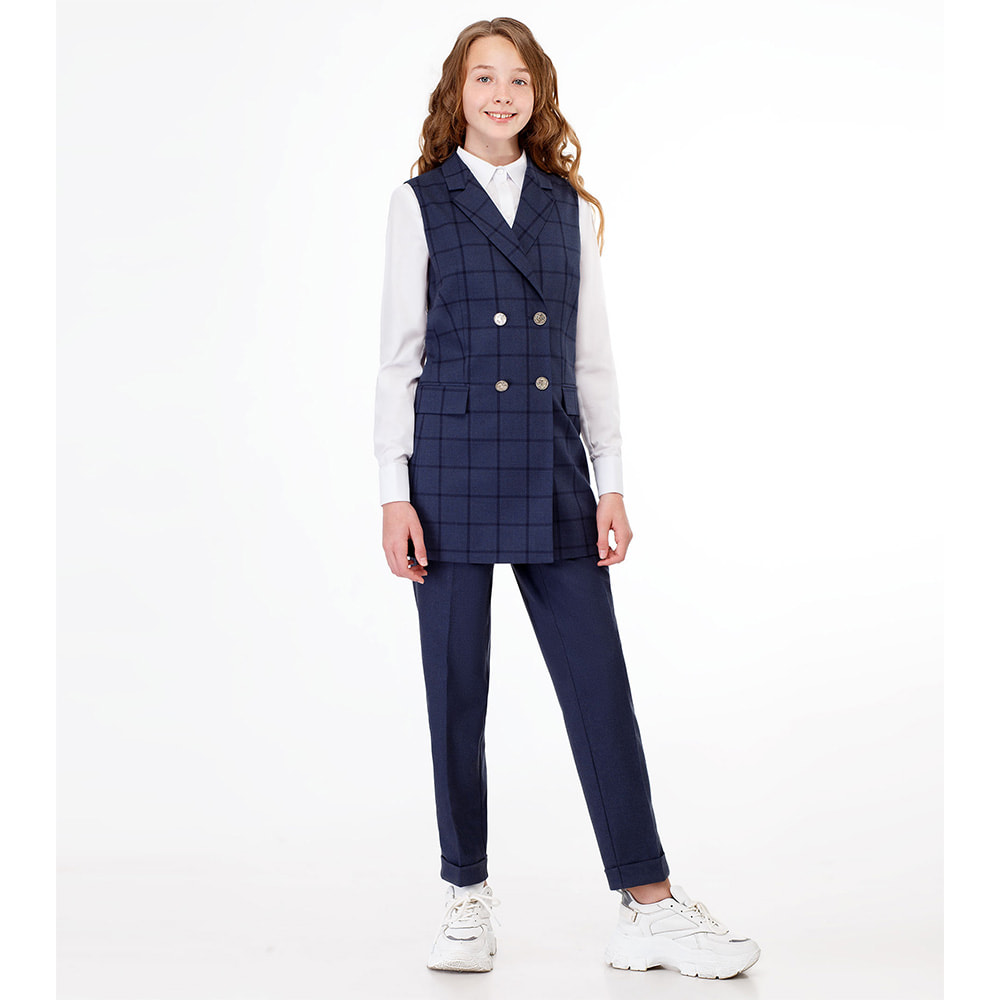 Стильная молодежная удлиненная жилетка для девочки. Жилет выполнен из вискозной ткани в клетку. Жилет двубортный на петли и пуговицы. Жилет с отрезными бочками, рельефными швами. По бокам горизонтальные карманы с клапаном. Жилет на притачной по низу подкл