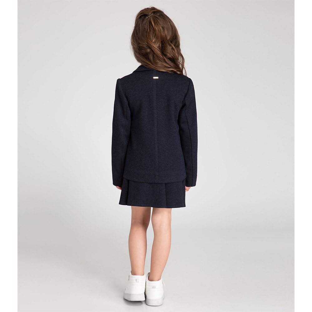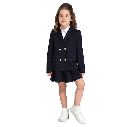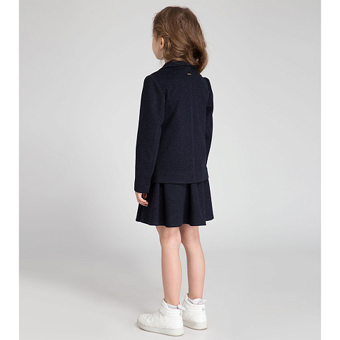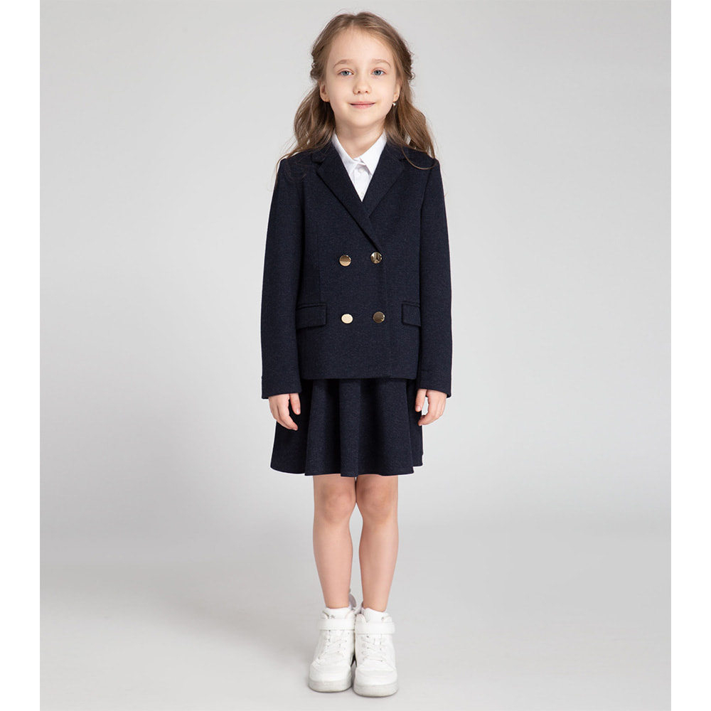 Жакет повседневный для девочки из трикотажного вискозного полотна. Жакет полуприлегающего силуэта. Воротник пиджачного типа. Рукава втачные, двухшовные, длинные . Жакет двубортный с застежкой напетли и пуговицы, которые служат так же декоративным элементом. Детали переда с отрезными бочками, горизонтально расположенными боковыми прорезными карманами с клапаном в рамку и вытачками от разрезов карманов. Спинка жакета со средним швом. На спинке расположен декоративный элемент - лейба металлическая. Трикотажный жакет - это не только комфортно и удобно для современного школьника. Но и стильно, ведь жакет отлично комплектуется как с брюками, так и с юбками.