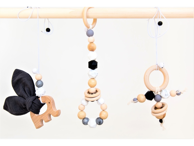 - Особенности Погремушки подвесные для игрового комплекса. Комплект из 3х штук. Состав: Пищевой силикон, можжевельник, клен, бук