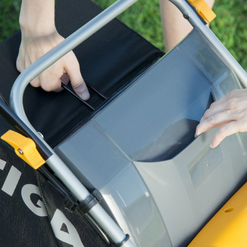 Данная модель газонокосилки имеет большой травосборник с индикатором уровня заполнения, для долгой беспрерывной работы