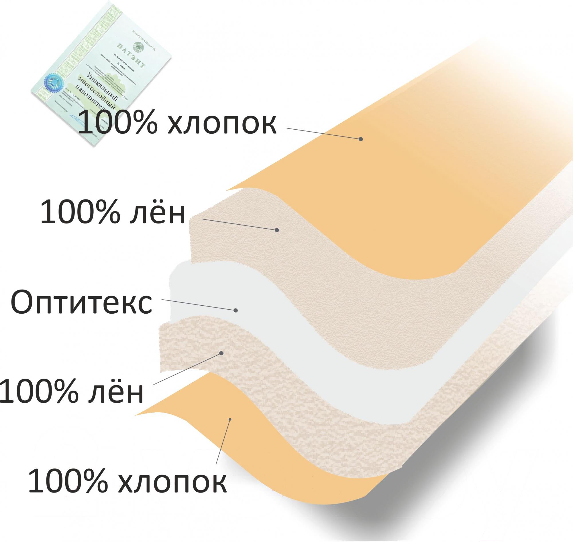 • Наполнитель полиэфирное волокно (силиконзированное Оптитекс) (внутренний слой), льняное волокно (внешний слой)