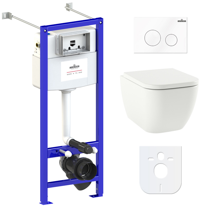 Комплект для монтажа подвесного унитаза. В стандартную комплектацию поставки входят: система инсталляции Relfix 38010020; удлиненный комплект креплений к стене (включено в артикул 38010020); звукоизолирующая пластина для унитаза (включена в артикул 38010020); клавиша смыва Relfix 3805002W; подвесной унитаз One 33020020; быстросъемное дюропластовое сиденье с медленно опускающейся крышкой и хромированными металлическими петлями (включено в артикул 33020020)..