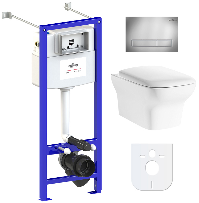 Комплект для монтажа подвесного унитаза. В стандартную комплектацию поставки входят: система инсталляции Relfix 38010020; удлиненный комплект креплений к стене (включено в артикул 38010020); звукоизолирующая пластина для унитаза (включена в артикул 38010020); клавиша смыва Relfix 3805001C; подвесной унитаз Bristol Rimless 3305002R; быстросъемное дюропластовое сиденье с медленно опускающейся крышкой и хромированными металлическими петлями (включено в артикул 3305002R)..