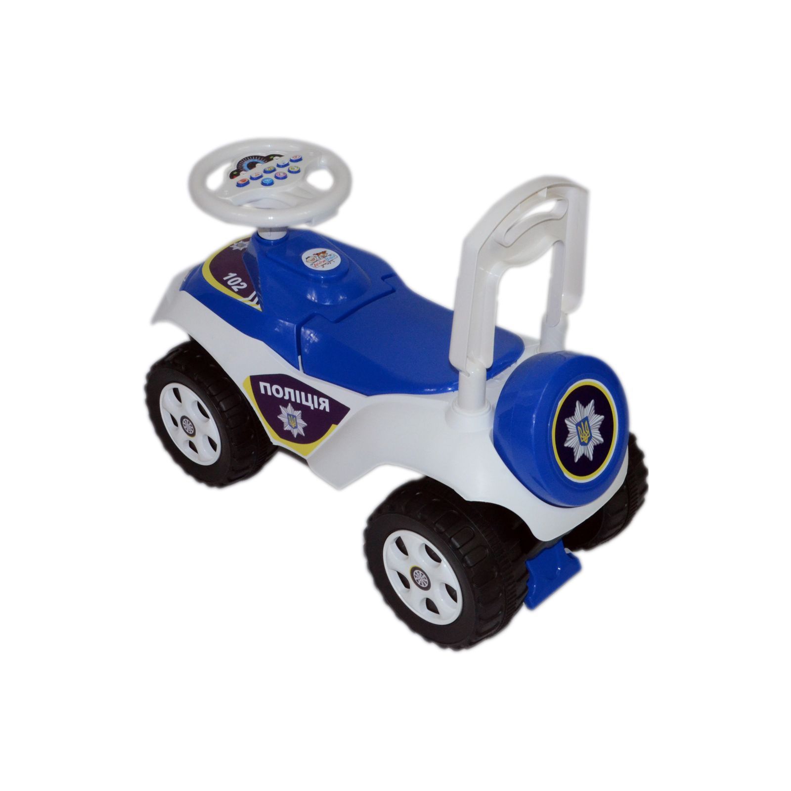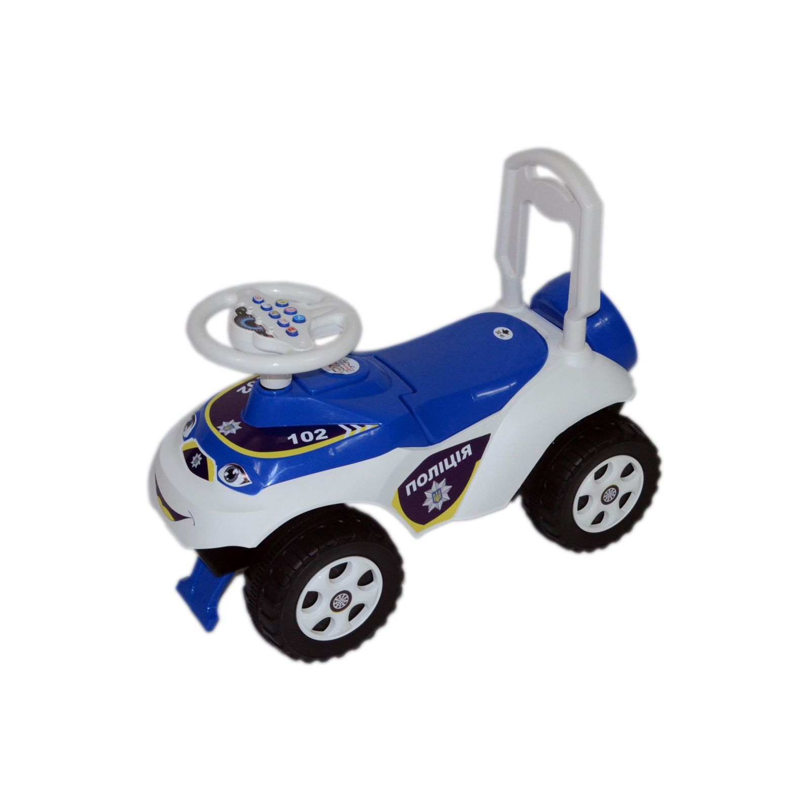 Під сидінням розміщений багажник для улюблених іграшок маленького водія. Особливо захопить вашого малюка кермо з різними звуковими ефектами, а також під час натискання кнопки на кермі, дитина почує навчання правилам дорожнього руху. Машинка виготовлена з високоякісного матеріалу, відповідає всім стандартам безпеки.