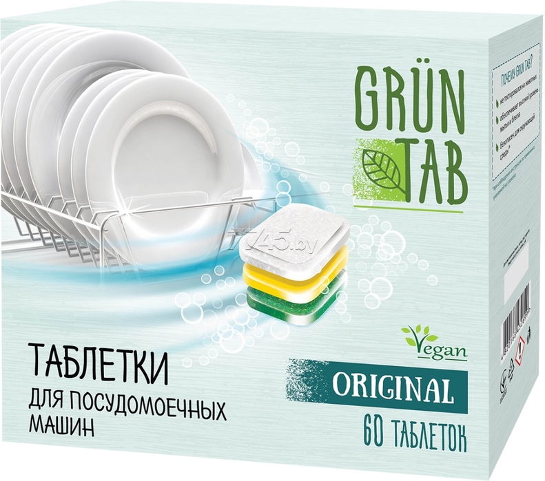 Таблетки для посудомоечных машин GRUN TAB Original 60 штук (4820168432750) - эти многофункциональные таблетки сочетают в себе действие сразу 3 средств и предназначены для мытья посуды, смягчения воды и ополаскивания.