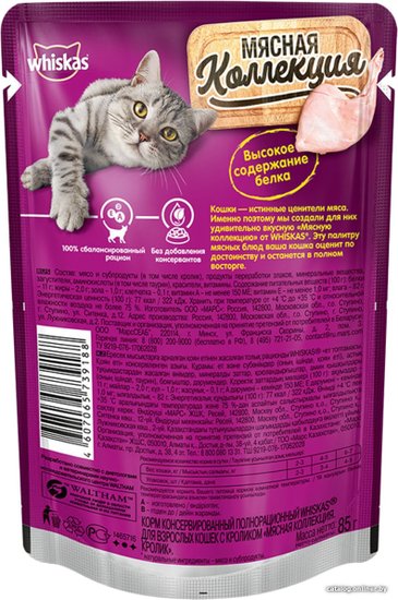 - Ингредиенты мясо и субпродукты (в том числе кролик), продукты переработки злаков, минеральные вещества, загустители, аминокислоты (в том числе таурин), красители, витамины.