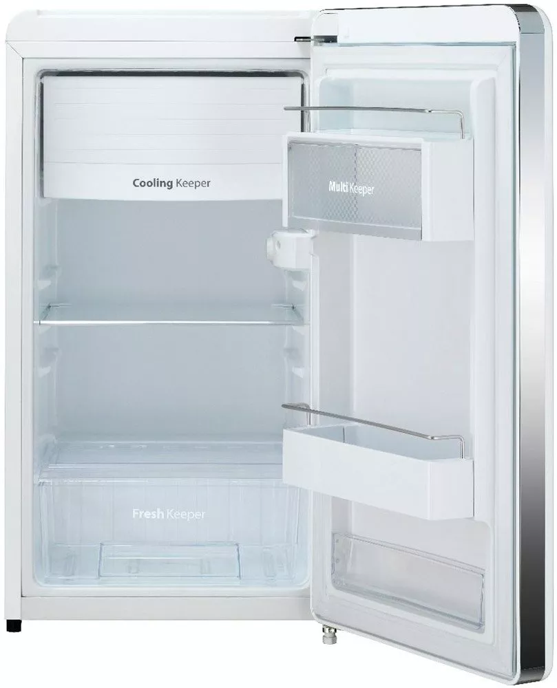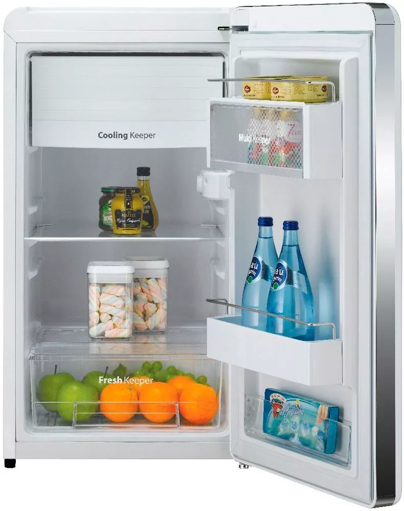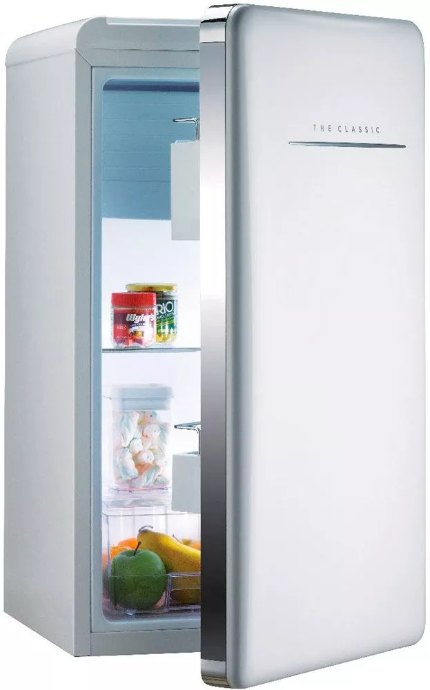 Отдельно стоящий, однокамерный, компоновка без морозильника, класс энергопотребления A+, объем холодильной камеры 124 л, электромеханическое управление, встроенные ручки.