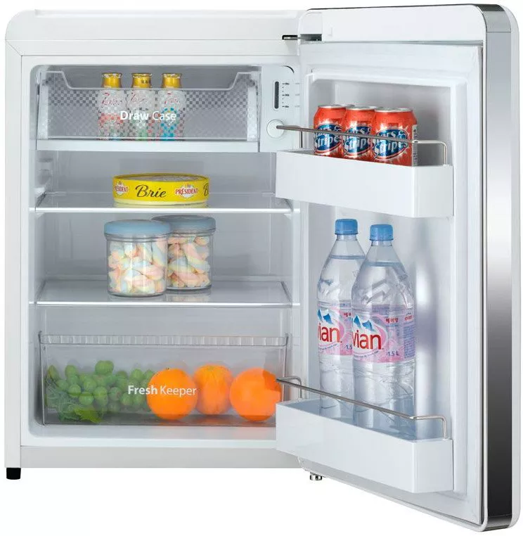 Отдельно стоящий, однокамерный, компоновка без морозильника, класс энергопотребления A+, объем холодильной камеры 79 л, электромеханическое управление, встроенные ручки.