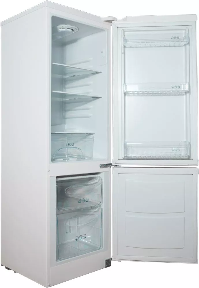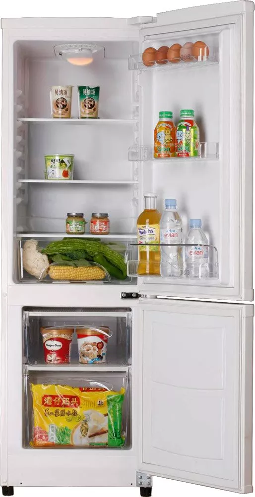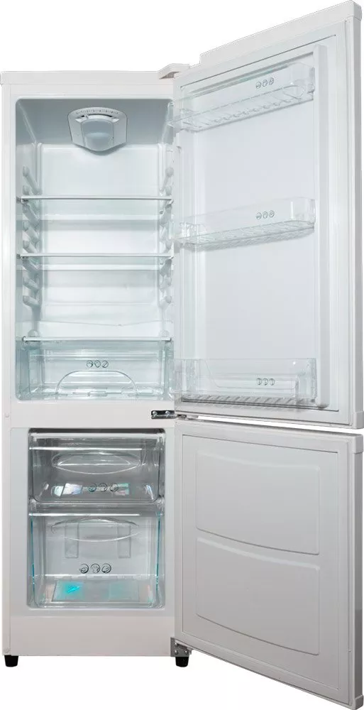 Отдельно стоящий, двухкамерный, компоновка морозильник внизу, класс энергопотребления A, объем холодильной камеры 106 л, объем морозильной камеры 32 л, электромеханическое управление, встроенные ручки.