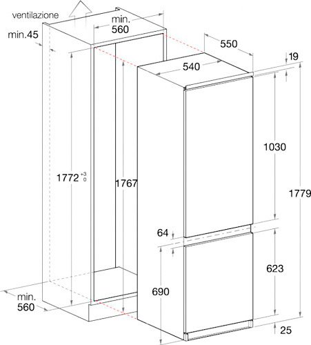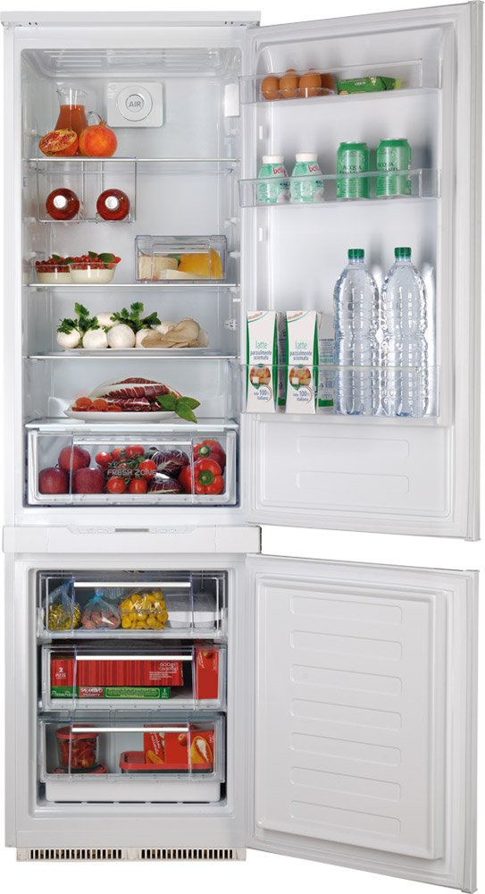 Встраиваемый, двухкамерный, компоновка морозильник внизу, класс энергопотребления A+, объем холодильной камеры 198 л, объем морозильной камеры 57 л, электронное управление, дисплей.