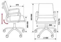 Для персонала, для руководителя, для посетителей; материал обивки: искусственная кожа; механизм качения; ролики; регулировка высоты; подлокотники; крестовина: металлическая хромированная; максимальная нагрузка: 120 кг.