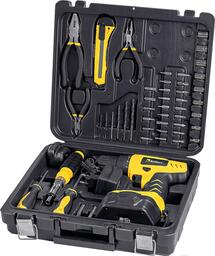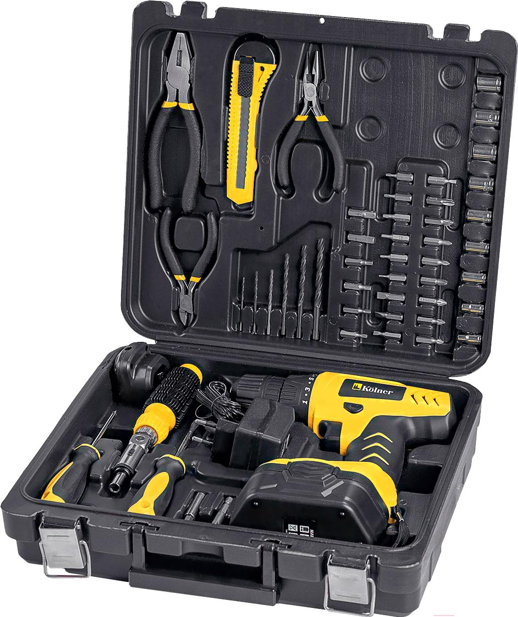 • В комплекте кейс, зарядное устройство, универсальный нож, головка (9 торцевых), удлинитель бит (для бит и головок), бита, переходник, сверла (6 шт.), отвертка (крестовая, шлицевая, с трещеткой), плоскогубцы (3 шт.), набор бит (23)
