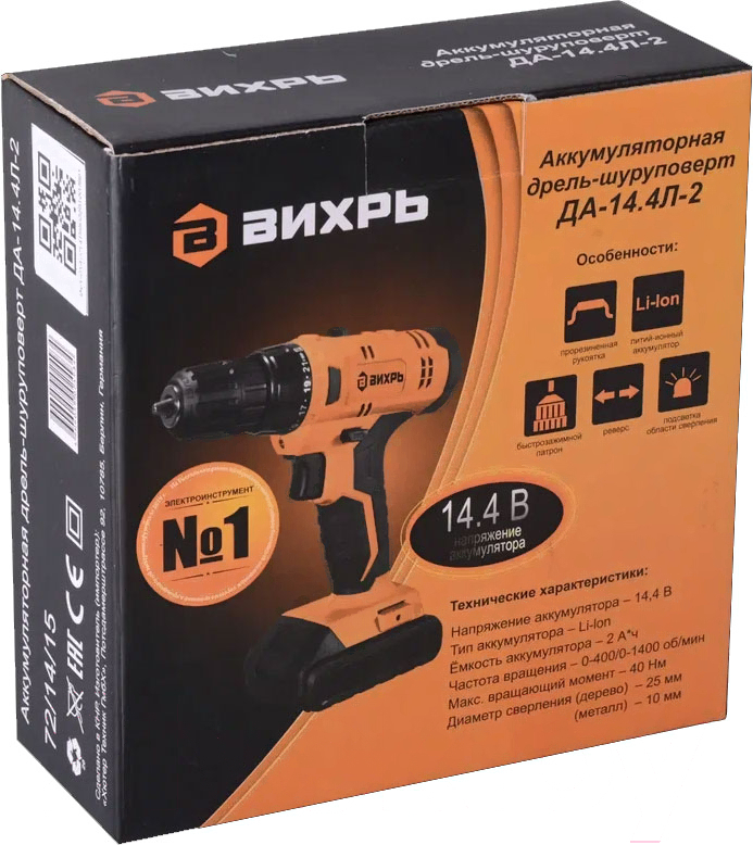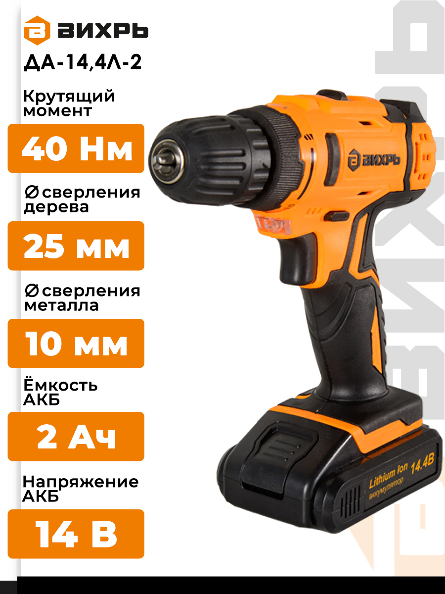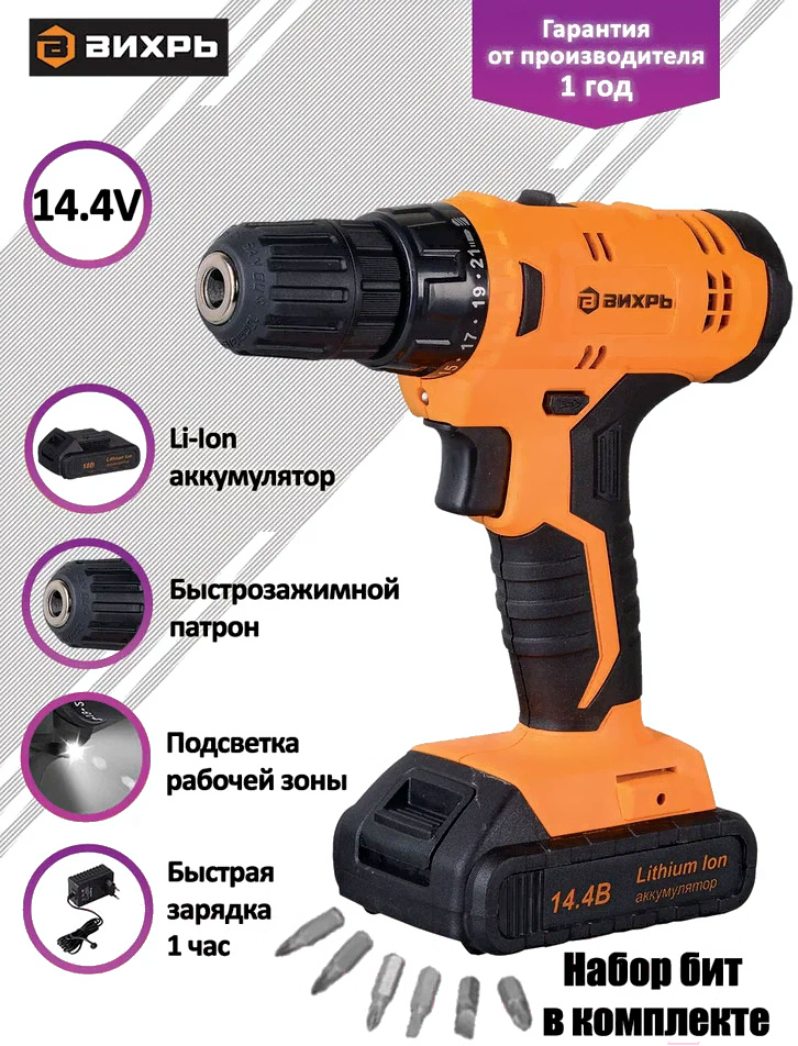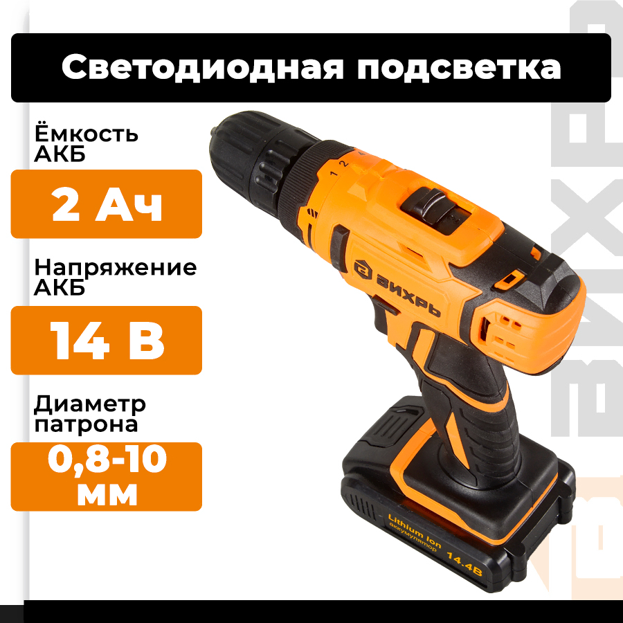 Аккумуляторная дрель-шуруповерт Вихрь ДА-14.4Л-2 (72/14/15)