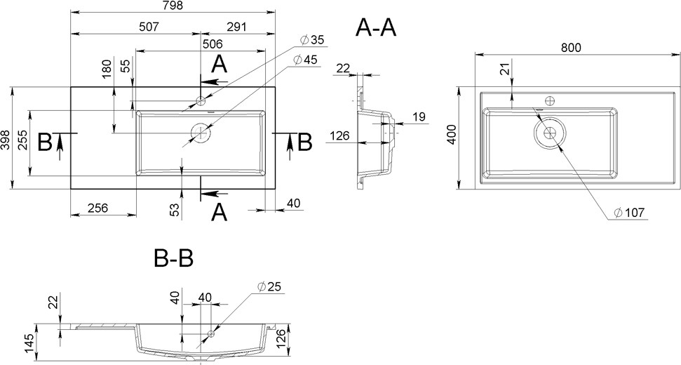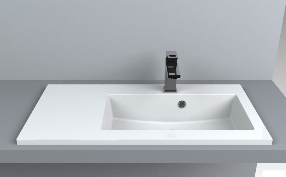 Умывальник врезной, ширина 800 мм, длина 400 мм, форма: прямоугольная, искусственный мрамор, отверстие под смеситель, отверстие под перелив.