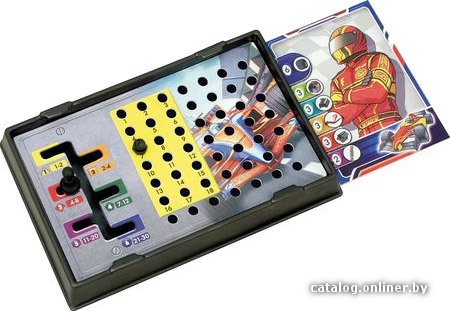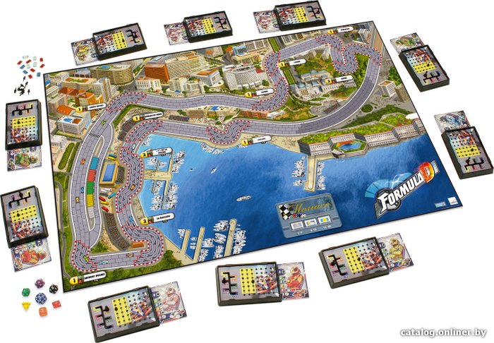 - Комплектация - 2 игровых поля (двухстороннее): с изображением кольцевой трассы Монако с одной стороны и ночной город с другой- 6 кубиков, обозначающих 6 передач болида- 1 чёрный кубик- 10 болидов Формулы 1 пяти цветов (для пяти команд)- 10 приборных панелей- 10 рычагов переключений передач- 70 маркеров для отметки Очков Прочности- правила игры на русском языке отдельно- коробка