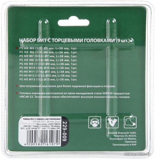 - Комплектация 1. Головка PS HX M5 (1/5) диаметр 5 мм, длина 38 мм, 1шт.2. Головка PS HX M6 (1/4) диаметр 6 мм, длина 38 мм, 1шт.3. Головка PS HX M7 (9/32) диаметр 7 мм, длина 38 мм, 1шт.4. Головка PS HX M8 (5/16) диаметр 8 мм, длина 38 мм, 1шт.5. Головка PS HX M9 (11/32) диаметр 9 мм, длина 38 мм, 1шт.6. Головка PS HX M10 (3/8) диаметр 10 мм, длина 38 мм, 1шт.7. Головка PS HX M11 (7/16) диаметр 11 мм, длина 38 мм, 1шт.8. Головка PS HX M12 (15/32) диаметр 12 мм, длина 38 мм, 1шт.9. Головка PS HX M13 (1/2) диаметр 13 мм, длина 38 мм, 1шт.