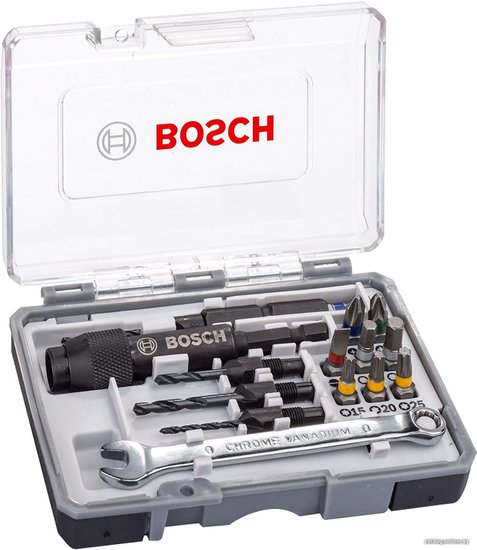 • Комплектация Биты PH2 (2 шт.) / PZ2 / S5 / HEX4, HEX5 / T15, T20, T25 / HSS 2,0/2,5/3,0/3,5 мм / Зажим / Втулка с зенкером / Гаечный ключ