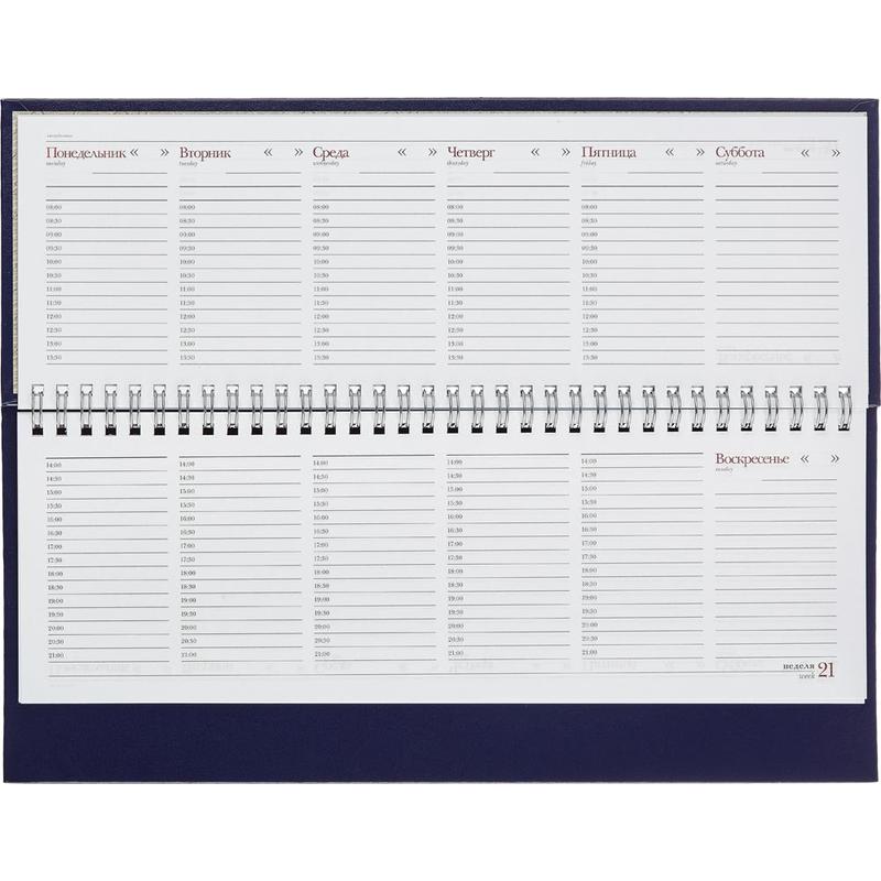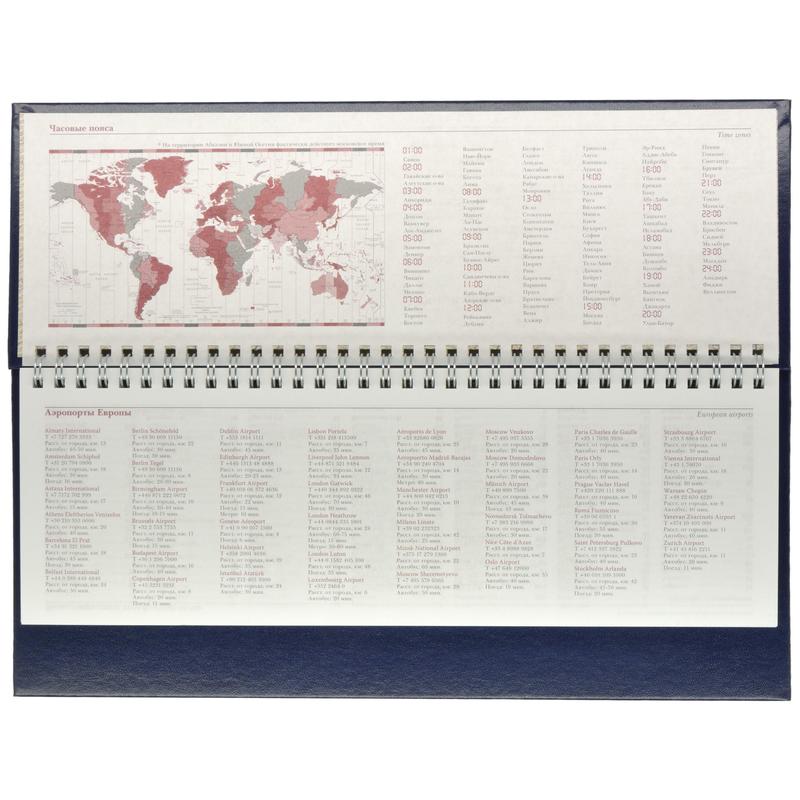 Планинг недатированный. Коллекции Ideal. Размер 305×130 мм. Твердая обложка планинга Ideal выполнена из балакрона — переплетного материала на бумажной основе, на одну сторону которого нанесено окрашенное модифицированное ПВХ покрытие, имитирующее кожу. Данный материал применяется для переплетов книг, ежедневников. Тип крепления — спираль. Возможно нанесение тиснения — лазерная гравировка, шелкография, УФ-печать, фольга. Блок: 64 листа (128 страниц), белая высококачественная офсетная бумага, плотностью 70 г/кв. м, печать в 2 цвета. Информационный блок: личные данные, часовые пояса, аэропорты Европы (вся справочная информация на 15 страниц).