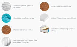 • Материалы кокосовая койра (2 слоя: 10 мм/20 мм), пеноматериал с памятью формы (MemoryFoam) (40 мм), пеноматериал (Polyurethane Foam) (20 мм)