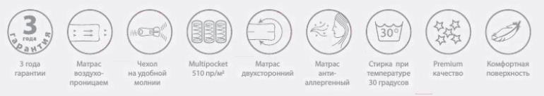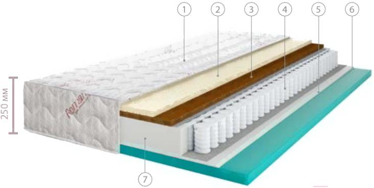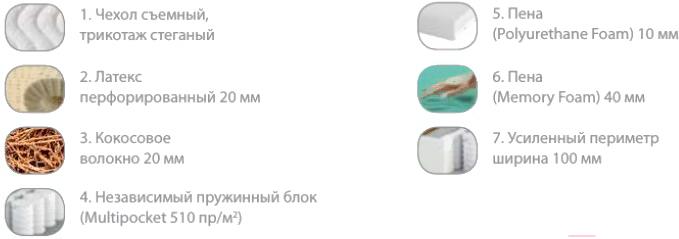 • Материалы кокосовая койра (20 мм), латекс (перфорированный, 20 мм), пеноматериал с памятью формы (MemoryFoam) (40 мм), пеноматериал (Polyurethane Foam) (10 мм)