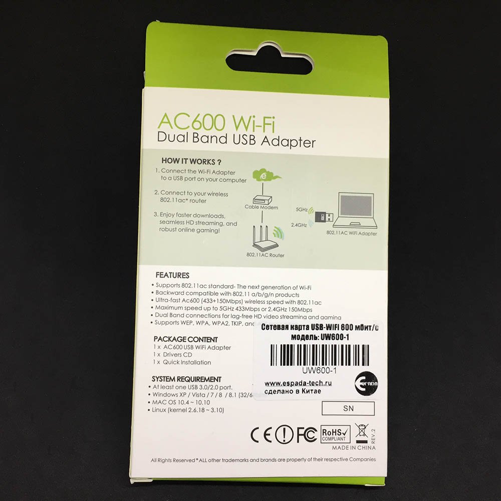 Двухдиапазонный беспроводной USB-адаптер обеспечивает передачу данных со скоростью до 150 Мбит/с на частоте 2.4 ГГц и до 433 Мбит/с для 5 ГГц. Адаптер может использоваться для компьютера, PSP, медиа-плеера или другого устройство, которое нуждается в беспроводной связи. Поддержка стандартов Wi-Fi: 802.11ac/a/b/g/n.