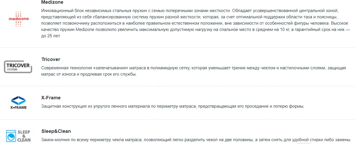 • Технологии X-Frame (Vegas), Sleep&Clean (Vegas), Tricover (Vegas), Medizone (Vegas)